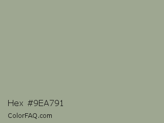 Hex #9ea791 Color is a light green color and the nearest color is Lemon Grass #9b9e8f. Hex code #9ea791 and RGB value is rgb(158,167,145). In RGB color space, this color is composed of 62% red, 65% green, 57% blue, In CMYK color space, this color is composed of 5% cyan, 0% magenta, 13% yellow , 35% black , In HSL color space, this color has a hue angle of 85° , 11% saturation and 61% lightness.