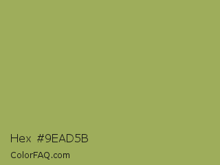 Hex #9ead5b Color is a normal lime color and the nearest color is Green Smoke #a4af6e. Hex code #9ead5b and RGB value is rgb(158,173,91). In RGB color space, this color is composed of 62% red, 68% green, 36% blue, In CMYK color space, this color is composed of 9% cyan, 0% magenta, 47% yellow , 32% black , In HSL color space, this color has a hue angle of 71° , 33% saturation and 52% lightness.