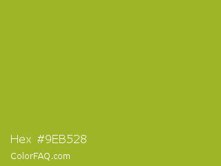 Hex #9eb528 Color is a normal yellow color and the nearest color is Citron #9fa91f. Hex code #9eb528 and RGB value is rgb(158,181,40). In RGB color space, this color is composed of 62% red, 71% green, 16% blue, In CMYK color space, this color is composed of 13% cyan, 0% magenta, 78% yellow , 29% black , In HSL color space, this color has a hue angle of 70° , 64% saturation and 43% lightness.