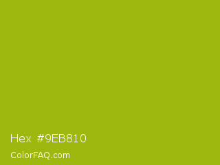 Hex #9eb810 Color is a normal yellow color and the nearest color is Pistachio Green #9dc209. Hex code #9eb810 and RGB value is rgb(158,184,16). In RGB color space, this color is composed of 62% red, 72% green, 6% blue, In CMYK color space, this color is composed of 14% cyan, 0% magenta, 91% yellow , 28% black , In HSL color space, this color has a hue angle of 69° , 84% saturation and 39% lightness.
