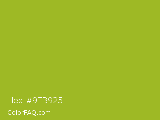 Hex #9eb925 Color is a normal lime color and the nearest color is Citron #9fa91f. Hex code #9eb925 and RGB value is rgb(158,185,37). In RGB color space, this color is composed of 62% red, 73% green, 15% blue, In CMYK color space, this color is composed of 15% cyan, 0% magenta, 80% yellow , 27% black , In HSL color space, this color has a hue angle of 71° , 67% saturation and 44% lightness.