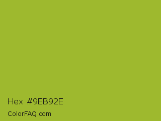 Hex #9eb92e Color is a normal lime color and the nearest color is Android Green #a4c639. Hex code #9eb92e and RGB value is rgb(158,185,46). In RGB color space, this color is composed of 62% red, 73% green, 18% blue, In CMYK color space, this color is composed of 15% cyan, 0% magenta, 75% yellow , 27% black , In HSL color space, this color has a hue angle of 72° , 60% saturation and 45% lightness.