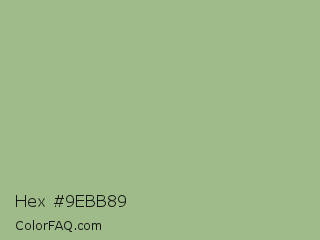 Hex #9ebb89 Color is a light green color and the nearest color is Swamp Green #acb78e. Hex code #9ebb89 and RGB value is rgb(158,187,137). In RGB color space, this color is composed of 62% red, 73% green, 54% blue, In CMYK color space, this color is composed of 16% cyan, 0% magenta, 27% yellow , 27% black , In HSL color space, this color has a hue angle of 95° , 27% saturation and 64% lightness.