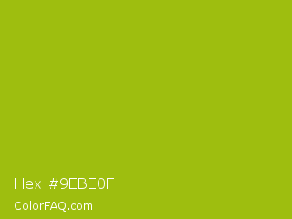 Hex #9ebe0f Color is a normal lime color and the nearest color is Pistachio Green #9dc209. Hex code #9ebe0f and RGB value is rgb(158,190,15). In RGB color space, this color is composed of 62% red, 75% green, 6% blue, In CMYK color space, this color is composed of 17% cyan, 0% magenta, 92% yellow , 25% black , In HSL color space, this color has a hue angle of 71° , 85% saturation and 40% lightness.