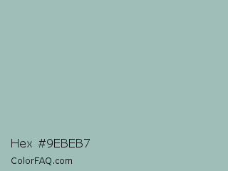 Hex #9ebeb7 Color is a light cyan color and the nearest color is Shadow Green #9ac2b8. Hex code #9ebeb7 and RGB value is rgb(158,190,183). In RGB color space, this color is composed of 62% red, 75% green, 72% blue, In CMYK color space, this color is composed of 17% cyan, 0% magenta, 4% yellow , 25% black , In HSL color space, this color has a hue angle of 167° , 20% saturation and 68% lightness.