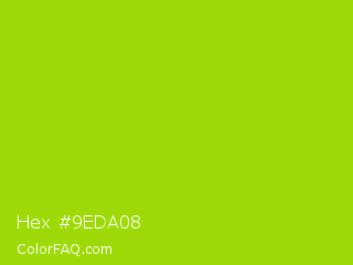 Hex #9eda08 Color is a normal lime color and the nearest color is Vivid Lime Green #a6d608. Hex code #9eda08 and RGB value is rgb(158,218,8). In RGB color space, this color is composed of 62% red, 85% green, 3% blue, In CMYK color space, this color is composed of 28% cyan, 0% magenta, 96% yellow , 15% black , In HSL color space, this color has a hue angle of 77° , 93% saturation and 44% lightness.