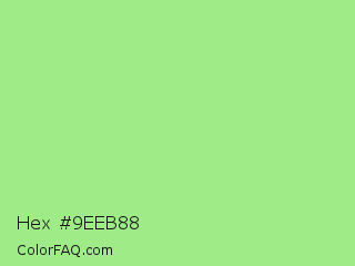 Hex #9eeb88 Color is a light green color and the nearest color is Feijoa #9fdd8c. Hex code #9eeb88 and RGB value is rgb(158,235,136). In RGB color space, this color is composed of 62% red, 92% green, 53% blue, In CMYK color space, this color is composed of 33% cyan, 0% magenta, 42% yellow , 8% black , In HSL color space, this color has a hue angle of 107° , 71% saturation and 73% lightness.