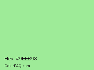 Hex #9eeb98 Color is a light green color and the nearest color is Granny Smith Apple Crayola #9de093. Hex code #9eeb98 and RGB value is rgb(158,235,152). In RGB color space, this color is composed of 62% red, 92% green, 60% blue, In CMYK color space, this color is composed of 33% cyan, 0% magenta, 35% yellow , 8% black , In HSL color space, this color has a hue angle of 116° , 67% saturation and 76% lightness.