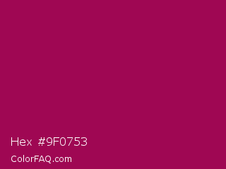 Hex #9f0753 Color is a normal rose color and the nearest color is Jazzberry Jam #a50b5e. Hex code #9f0753 and RGB value is rgb(159,7,83). In RGB color space, this color is composed of 62% red, 3% green, 33% blue, In CMYK color space, this color is composed of 0% cyan, 96% magenta, 48% yellow , 38% black , In HSL color space, this color has a hue angle of 330° , 92% saturation and 33% lightness.