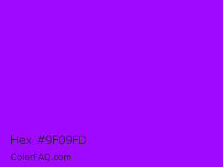 Hex #9f09fd Color is a normal purple color and the nearest color is Vivid Violet #9f00ff. Hex code #9f09fd and RGB value is rgb(159,9,253). In RGB color space, this color is composed of 62% red, 4% green, 99% blue, In CMYK color space, this color is composed of 37% cyan, 96% magenta, 0% yellow , 1% black , In HSL color space, this color has a hue angle of 277° , 98% saturation and 51% lightness.