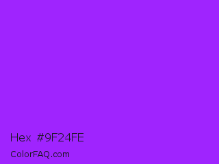 Hex #9f24fe Color is a normal purple color and the nearest color is Veronica #a020f0. Hex code #9f24fe and RGB value is rgb(159,36,254). In RGB color space, this color is composed of 62% red, 14% green, 100% blue, In CMYK color space, this color is composed of 37% cyan, 86% magenta, 0% yellow , 0% black , In HSL color space, this color has a hue angle of 274° , 99% saturation and 57% lightness.