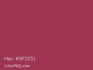 Hex #9f3551 Color is a normal rose color and the nearest color is Night Shadz #aa375a. Hex code #9f3551 and RGB value is rgb(159,53,81). In RGB color space, this color is composed of 62% red, 21% green, 32% blue, In CMYK color space, this color is composed of 0% cyan, 67% magenta, 49% yellow , 38% black , In HSL color space, this color has a hue angle of 344° , 50% saturation and 42% lightness.