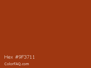 Hex #9f3711 Color is a normal orange color and the nearest color is Cognac #9f381d. Hex code #9f3711 and RGB value is rgb(159,55,17). In RGB color space, this color is composed of 62% red, 22% green, 7% blue, In CMYK color space, this color is composed of 0% cyan, 65% magenta, 89% yellow , 38% black , In HSL color space, this color has a hue angle of 16° , 81% saturation and 35% lightness.
