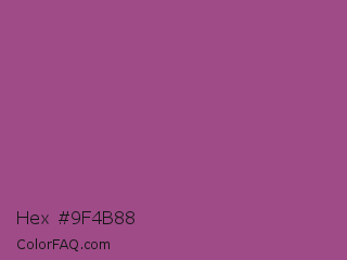 Hex #9f4b88 Color is a normal magenta color and the nearest color is Plum #8e4585. Hex code #9f4b88 and RGB value is rgb(159,75,136). In RGB color space, this color is composed of 62% red, 29% green, 53% blue, In CMYK color space, this color is composed of 0% cyan, 53% magenta, 14% yellow , 38% black , In HSL color space, this color has a hue angle of 316° , 36% saturation and 46% lightness.