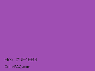 Hex #9f4eb3 Color is a normal purple color and the nearest color is Purple Plum #9c51b6. Hex code #9f4eb3 and RGB value is rgb(159,78,179). In RGB color space, this color is composed of 62% red, 31% green, 70% blue, In CMYK color space, this color is composed of 11% cyan, 56% magenta, 0% yellow , 30% black , In HSL color space, this color has a hue angle of 288° , 40% saturation and 50% lightness.