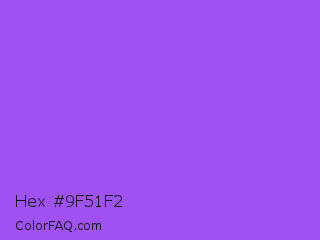 Hex #9f51f2 Color is a light violet color and the nearest color is Navy Purple #9457eb. Hex code #9f51f2 and RGB value is rgb(159,81,242). In RGB color space, this color is composed of 62% red, 32% green, 95% blue, In CMYK color space, this color is composed of 34% cyan, 67% magenta, 0% yellow , 5% black , In HSL color space, this color has a hue angle of 269° , 86% saturation and 63% lightness.