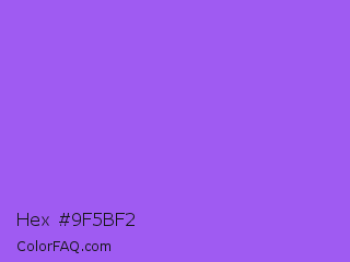Hex #9f5bf2 Color is a light violet color and the nearest color is Navy Purple #9457eb. Hex code #9f5bf2 and RGB value is rgb(159,91,242). In RGB color space, this color is composed of 62% red, 36% green, 95% blue, In CMYK color space, this color is composed of 34% cyan, 62% magenta, 0% yellow , 5% black , In HSL color space, this color has a hue angle of 267° , 85% saturation and 65% lightness.