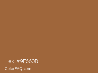 Hex #9f663b Color is a normal orange color and the nearest color is Cape Palliser #a26645. Hex code #9f663b and RGB value is rgb(159,102,59). In RGB color space, this color is composed of 62% red, 40% green, 23% blue, In CMYK color space, this color is composed of 0% cyan, 36% magenta, 63% yellow , 38% black , In HSL color space, this color has a hue angle of 26° , 46% saturation and 43% lightness.