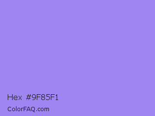 Hex #9f85f1 Color is a light indigo color and the nearest color is Dull Lavender #a899e6. Hex code #9f85f1 and RGB value is rgb(159,133,241). In RGB color space, this color is composed of 62% red, 52% green, 95% blue, In CMYK color space, this color is composed of 34% cyan, 45% magenta, 0% yellow , 5% black , In HSL color space, this color has a hue angle of 254° , 79% saturation and 73% lightness.