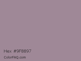 Hex #9f8897 Color is a normal magenta color and the nearest color is Mountain Mist #959396. Hex code #9f8897 and RGB value is rgb(159,136,151). In RGB color space, this color is composed of 62% red, 53% green, 59% blue, In CMYK color space, this color is composed of 0% cyan, 14% magenta, 5% yellow , 38% black , In HSL color space, this color has a hue angle of 321° , 11% saturation and 58% lightness.