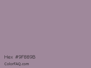 Hex #9f889b Color is a normal magenta color and the nearest color is Mountain Mist #959396. Hex code #9f889b and RGB value is rgb(159,136,155). In RGB color space, this color is composed of 62% red, 53% green, 61% blue, In CMYK color space, this color is composed of 0% cyan, 14% magenta, 3% yellow , 38% black , In HSL color space, this color has a hue angle of 310° , 11% saturation and 58% lightness.