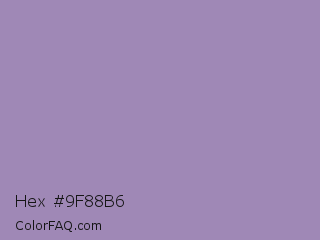 Hex #9f88b6 Color is a light violet color and the nearest color is Amethyst Smoke #a397b4. Hex code #9f88b6 and RGB value is rgb(159,136,182). In RGB color space, this color is composed of 62% red, 53% green, 71% blue, In CMYK color space, this color is composed of 13% cyan, 25% magenta, 0% yellow , 29% black , In HSL color space, this color has a hue angle of 270° , 24% saturation and 62% lightness.