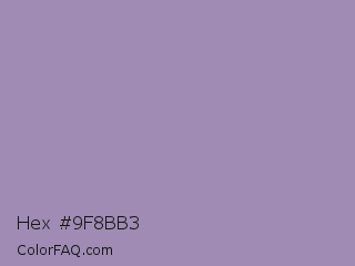 Hex #9f8bb3 Color is a light violet color and the nearest color is Amethyst Smoke #a397b4. Hex code #9f8bb3 and RGB value is rgb(159,139,179). In RGB color space, this color is composed of 62% red, 55% green, 70% blue, In CMYK color space, this color is composed of 11% cyan, 22% magenta, 0% yellow , 30% black , In HSL color space, this color has a hue angle of 270° , 21% saturation and 62% lightness.