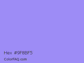 Hex #9f8bf5 Color is a light indigo color and the nearest color is Dull Lavender #a899e6. Hex code #9f8bf5 and RGB value is rgb(159,139,245). In RGB color space, this color is composed of 62% red, 55% green, 96% blue, In CMYK color space, this color is composed of 35% cyan, 43% magenta, 0% yellow , 4% black , In HSL color space, this color has a hue angle of 251° , 84% saturation and 75% lightness.