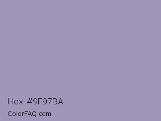 Hex #9f97ba Color is a light indigo color and the nearest color is Amethyst Smoke #a397b4. Hex code #9f97ba and RGB value is rgb(159,151,186). In RGB color space, this color is composed of 62% red, 59% green, 73% blue, In CMYK color space, this color is composed of 15% cyan, 19% magenta, 0% yellow , 27% black , In HSL color space, this color has a hue angle of 254° , 20% saturation and 66% lightness.