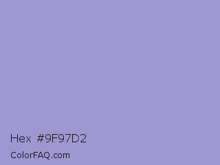 Hex #9f97d2 Color is a light indigo color and the nearest color is Blue Bell Crayola #9999cc. Hex code #9f97d2 and RGB value is rgb(159,151,210). In RGB color space, this color is composed of 62% red, 59% green, 82% blue, In CMYK color space, this color is composed of 24% cyan, 28% magenta, 0% yellow , 18% black , In HSL color space, this color has a hue angle of 248° , 40% saturation and 71% lightness.