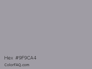 Hex #9f9ca4 Color is a light violet color and the nearest color is Star Dust #9f9f9c. Hex code #9f9ca4 and RGB value is rgb(159,156,164). In RGB color space, this color is composed of 62% red, 61% green, 64% blue, In CMYK color space, this color is composed of 3% cyan, 5% magenta, 0% yellow , 36% black , In HSL color space, this color has a hue angle of 263° , 4% saturation and 63% lightness.