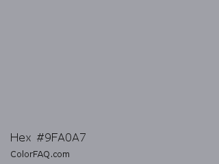 Hex #9fa0a7 Color is a light blue color and the nearest color is Quick Silver #a6a6a6. Hex code #9fa0a7 and RGB value is rgb(159,160,167). In RGB color space, this color is composed of 62% red, 63% green, 65% blue, In CMYK color space, this color is composed of 5% cyan, 4% magenta, 0% yellow , 35% black , In HSL color space, this color has a hue angle of 233° , 4% saturation and 64% lightness.