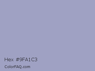 Hex #9fa1c3 Color is a light blue color and the nearest color is Blue Bell #a2a2d0. Hex code #9fa1c3 and RGB value is rgb(159,161,195). In RGB color space, this color is composed of 62% red, 63% green, 76% blue, In CMYK color space, this color is composed of 18% cyan, 17% magenta, 0% yellow , 24% black , In HSL color space, this color has a hue angle of 237° , 23% saturation and 69% lightness.