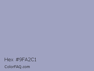 Hex #9fa2c1 Color is a light blue color and the nearest color is Gull Gray #9dacb7. Hex code #9fa2c1 and RGB value is rgb(159,162,193). In RGB color space, this color is composed of 62% red, 64% green, 76% blue, In CMYK color space, this color is composed of 18% cyan, 16% magenta, 0% yellow , 24% black , In HSL color space, this color has a hue angle of 235° , 22% saturation and 69% lightness.