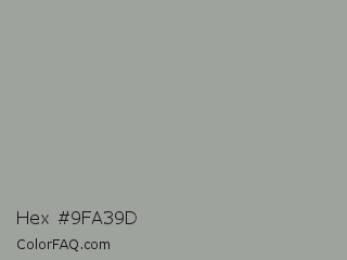 Hex #9fa39d Color is a light green color and the nearest color is Star Dust #9f9f9c. Hex code #9fa39d and RGB value is rgb(159,163,157). In RGB color space, this color is composed of 62% red, 64% green, 62% blue, In CMYK color space, this color is composed of 2% cyan, 0% magenta, 4% yellow , 36% black , In HSL color space, this color has a hue angle of 100° , 3% saturation and 63% lightness.
