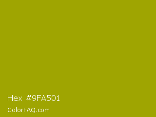 Hex #9fa501 Color is a normal yellow color and the nearest color is Apple Green #8db600. Hex code #9fa501 and RGB value is rgb(159,165,1). In RGB color space, this color is composed of 62% red, 65% green, 0% blue, In CMYK color space, this color is composed of 4% cyan, 0% magenta, 99% yellow , 35% black , In HSL color space, this color has a hue angle of 62° , 99% saturation and 33% lightness.