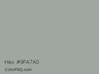 Hex #9fa7a0 Color is a light green color and the nearest color is Delta #a4a49d. Hex code #9fa7a0 and RGB value is rgb(159,167,160). In RGB color space, this color is composed of 62% red, 65% green, 63% blue, In CMYK color space, this color is composed of 5% cyan, 0% magenta, 4% yellow , 35% black , In HSL color space, this color has a hue angle of 128° , 4% saturation and 64% lightness.