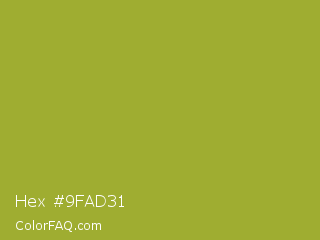 Hex #9fad31 Color is a normal yellow color and the nearest color is Citron #9fa91f. Hex code #9fad31 and RGB value is rgb(159,173,49). In RGB color space, this color is composed of 62% red, 68% green, 19% blue, In CMYK color space, this color is composed of 8% cyan, 0% magenta, 72% yellow , 32% black , In HSL color space, this color has a hue angle of 67° , 56% saturation and 44% lightness.