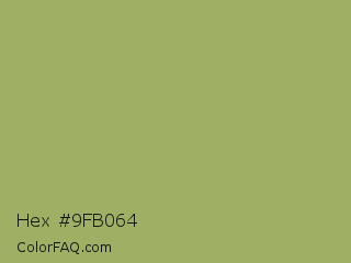 Hex #9fb064 Color is a normal lime color and the nearest color is Green Smoke #a4af6e. Hex code #9fb064 and RGB value is rgb(159,176,100). In RGB color space, this color is composed of 62% red, 69% green, 39% blue, In CMYK color space, this color is composed of 10% cyan, 0% magenta, 43% yellow , 31% black , In HSL color space, this color has a hue angle of 73° , 32% saturation and 54% lightness.