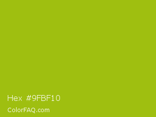 Hex #9fbf10 Color is a normal lime color and the nearest color is Pistachio Green #9dc209. Hex code #9fbf10 and RGB value is rgb(159,191,16). In RGB color space, this color is composed of 62% red, 75% green, 6% blue, In CMYK color space, this color is composed of 17% cyan, 0% magenta, 92% yellow , 25% black , In HSL color space, this color has a hue angle of 71° , 85% saturation and 41% lightness.