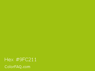Hex #9fc211 Color is a normal lime color and the nearest color is Citrus #a1c50a. Hex code #9fc211 and RGB value is rgb(159,194,17). In RGB color space, this color is composed of 62% red, 76% green, 7% blue, In CMYK color space, this color is composed of 18% cyan, 0% magenta, 91% yellow , 24% black , In HSL color space, this color has a hue angle of 72° , 84% saturation and 41% lightness.