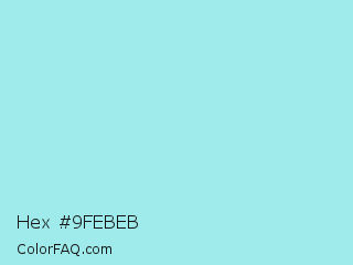 Hex #9febeb Color is a light cyan color and the nearest color is Blizzard Blue Crayola #a3e3ed. Hex code #9febeb and RGB value is rgb(159,235,235). In RGB color space, this color is composed of 62% red, 92% green, 92% blue, In CMYK color space, this color is composed of 32% cyan, 0% magenta, 0% yellow , 8% black , In HSL color space, this color has a hue angle of 180° , 66% saturation and 77% lightness.