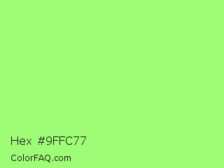 Hex #9ffc77 Color is a light green color and the nearest color is Light Green #90ee90. Hex code #9ffc77 and RGB value is rgb(159,252,119). In RGB color space, this color is composed of 62% red, 99% green, 47% blue, In CMYK color space, this color is composed of 37% cyan, 0% magenta, 53% yellow , 1% black , In HSL color space, this color has a hue angle of 102° , 96% saturation and 73% lightness.