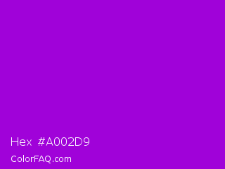 Hex #a002d9 Color is a normal purple color and the nearest color is Dark Violet #9400d3. Hex code #a002d9 and RGB value is rgb(160,2,217). In RGB color space, this color is composed of 63% red, 1% green, 85% blue, In CMYK color space, this color is composed of 26% cyan, 99% magenta, 0% yellow , 15% black , In HSL color space, this color has a hue angle of 284° , 98% saturation and 43% lightness.
