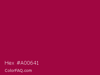 Hex #a00641 Color is a normal rose color and the nearest color is Pink Raspberry #980036. Hex code #a00641 and RGB value is rgb(160,6,65). In RGB color space, this color is composed of 63% red, 2% green, 25% blue, In CMYK color space, this color is composed of 0% cyan, 96% magenta, 59% yellow , 37% black , In HSL color space, this color has a hue angle of 337° , 93% saturation and 33% lightness.