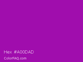 Hex #a00dad Color is a normal magenta color and the nearest color is Heliotrope Magenta #aa00bb. Hex code #a00dad and RGB value is rgb(160,13,173). In RGB color space, this color is composed of 63% red, 5% green, 68% blue, In CMYK color space, this color is composed of 8% cyan, 92% magenta, 0% yellow , 32% black , In HSL color space, this color has a hue angle of 295° , 86% saturation and 36% lightness.
