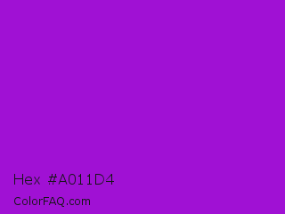 Hex #a011d4 Color is a normal purple color and the nearest color is Dark Violet #9400d3. Hex code #a011d4 and RGB value is rgb(160,17,212). In RGB color space, this color is composed of 63% red, 7% green, 83% blue, In CMYK color space, this color is composed of 25% cyan, 92% magenta, 0% yellow , 17% black , In HSL color space, this color has a hue angle of 284° , 85% saturation and 45% lightness.