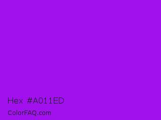 Hex #a011ed Color is a normal purple color and the nearest color is Veronica #a020f0. Hex code #a011ed and RGB value is rgb(160,17,237). In RGB color space, this color is composed of 63% red, 7% green, 93% blue, In CMYK color space, this color is composed of 32% cyan, 93% magenta, 0% yellow , 7% black , In HSL color space, this color has a hue angle of 279° , 87% saturation and 50% lightness.