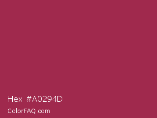 Hex #a0294d Color is a normal rose color and the nearest color is Amaranth Purple #ab274f. Hex code #a0294d and RGB value is rgb(160,41,77). In RGB color space, this color is composed of 63% red, 16% green, 30% blue, In CMYK color space, this color is composed of 0% cyan, 74% magenta, 52% yellow , 37% black , In HSL color space, this color has a hue angle of 342° , 59% saturation and 39% lightness.