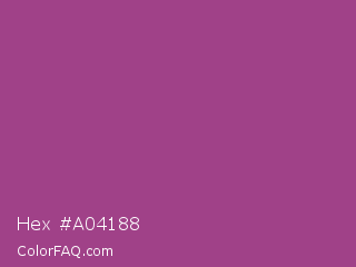 Hex #a04188 Color is a normal magenta color and the nearest color is Maximum Red Purple #a63a79. Hex code #a04188 and RGB value is rgb(160,65,136). In RGB color space, this color is composed of 63% red, 25% green, 53% blue, In CMYK color space, this color is composed of 0% cyan, 59% magenta, 15% yellow , 37% black , In HSL color space, this color has a hue angle of 315° , 42% saturation and 44% lightness.